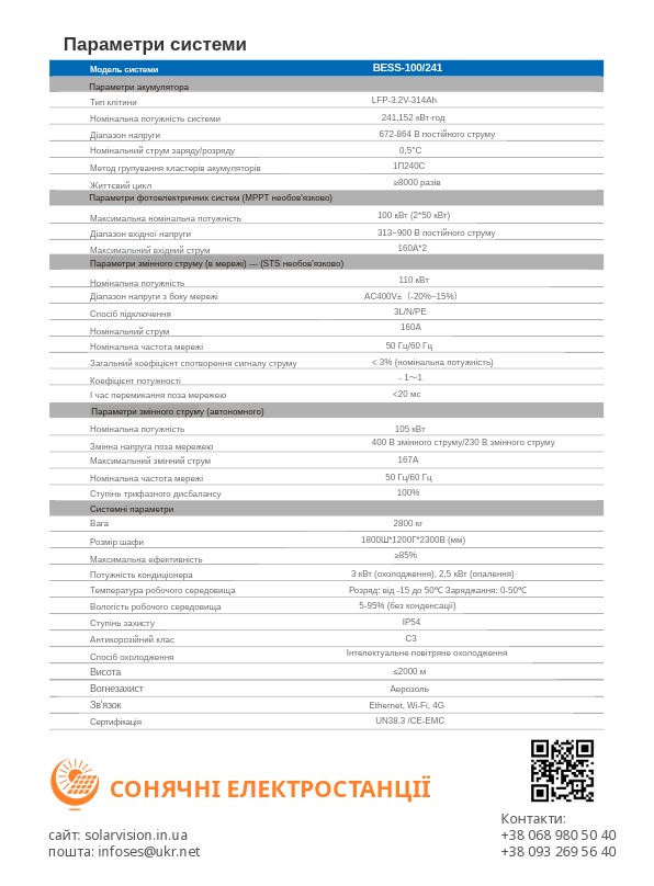 Система збереження енергії (СЗЕ) є стандартизованою пропозицією від компанії ТОВ "СОНЯЧНІ ЕЛЕКТРОСТАНЦІЇ", кожна шафа має номінальну ємність 241 кВт·год. Вона включає акумуляторний блок, високовольтний блок, інверторна система PCS, система контролю температури, система пожежної безпеки, блок розподілу живлення, система керування акумуляторами BMS та система керування енергією EMS з підтримкою APP функції. Він інтегрує передові технології, такі як «висока ефективність, висока безпека, тривалий термін служби, та легку масштабованість», формуючи модульну, стандартизовану та інтелектуальну систему зовнішньої енергетики системи зберігання енергії. Накопичувач енергії використовує філософію проектування «безпечні та надійні» компоненти, розроблені самостійно або придбані у провідних постачальників, що забезпечує клієнтів безпечним, надійним, економічно ефективним, високоякісним, простим у встановленні та розширенні, а також зручним у використанні продуктом для накопичення енергії, що спрощує будівництво проектів накопичення енергії та їх використання.